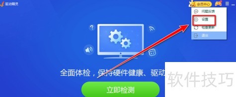 1、 打开驱动精灵,点击右上角的“设置”。