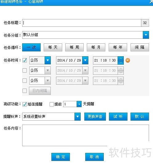 2、 如果你想设置闹钟,那么选择闹钟功能,进入相关的界面进行设置。选择新建闹钟就可以了。3填写任务标题,任务分组,任务循环,任务时间,高级功能,提醒铃声等信息,铃声可以进行更换。