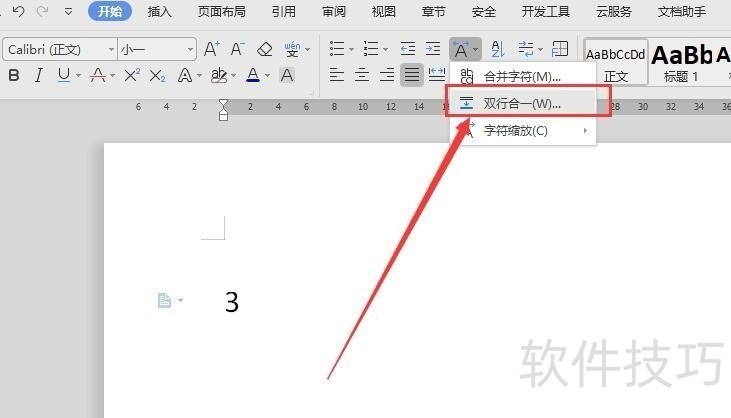 2、 然后先在文档里输入一个数字3,然后在“开始”菜单栏下选择“中文版式”(如下图)3在弹出的下拉列表中,选择“双行合一”(如下图)