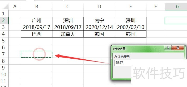 5、 【存放结果】对话框中,选择“B7”