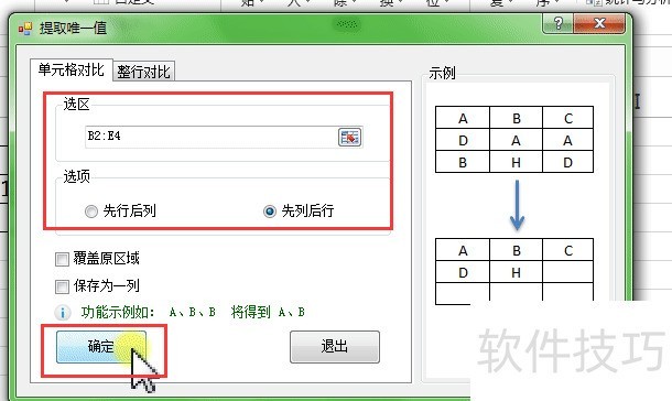 4、 【提取唯一值】对话框,【选区】选择B2:E4,【选项】“先列后行”,单击【确定】,如下图注:“覆盖原区域、保存为一列” 自行根据需求进行选择