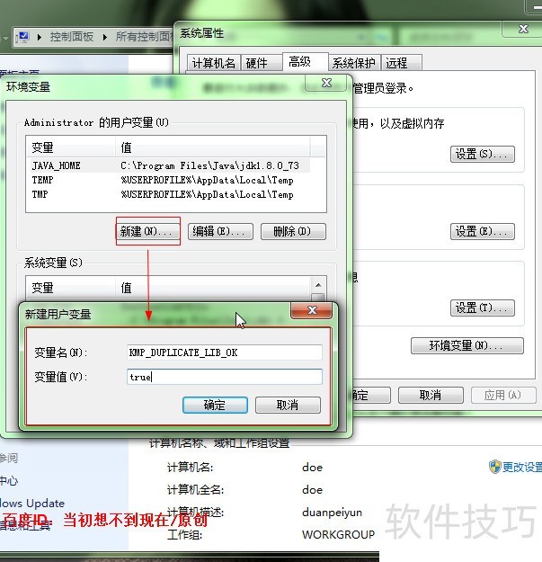 5、 在用户变量部分单击新建,变量名KMP_DUPLICATE_LIB_OK,变量值true!