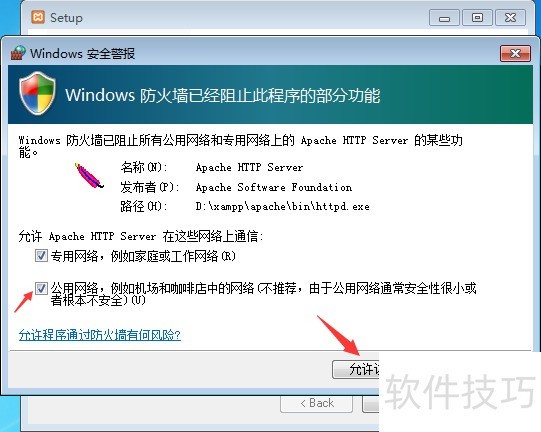8、 当XAMPP安装完毕后,如果开启了Windows防火墙,此刻会出现“Windows安全警报”,勾选“专用网络”和“公用网络”前的勾并点击“允许访问按钮”,允许“Apache HTTP Server”在这两种网络上通信;