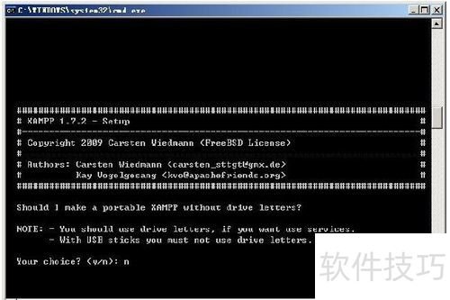 3、 接下来问我们是否定位xampp的正确路径,晕太快跑过去了,没抓到图,大概就是Should I locate the xampp path correctly这个样子,选择y并回车。4选择是否让xampp支持便携使用(无驱动器号),这里要注意,如果后面想把XAMPP注册为系统服务的话,是必须使用驱动器号的,如果要使用USB安装xampp就不能使用驱动器号,因为USB设备可能在不同PC机上的设备号可能有所变化。如下图。天缘安装的是到D盘,固定驱动器,所以就选N并回车。?