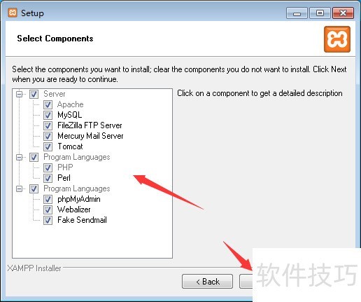 3、 在弹出的“选择组件窗口”中,勾选左侧列表中的所有组件(全部安装),然后点击“Next按钮”进入下一步;