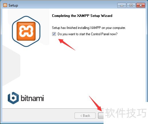 9、 在弹出的“完成安装窗口”中,勾选“Do you want to start the Control Panel Now?”前的勾(允许安装完毕后打开XAMPP的控制面板),然后点击“Finish按钮”完成安装;