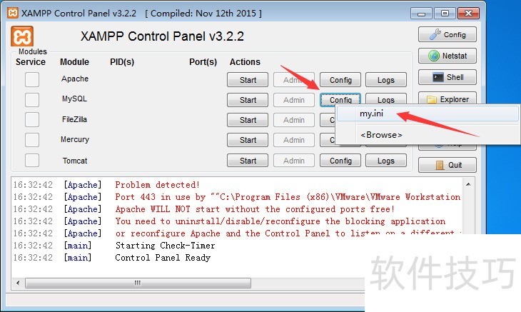 18、 设置完防火墙访问之后,会发现“XAMPP控制面板”中除了“Apache”之外,其他服务均已成功启动。查看信息框中给出的红色错误提示信息,发现Apache中默认使用的“443端口”已经被VMware占用了;