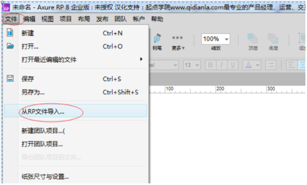 1、打开Axure RP,点击“文件”菜单,选择“从RP文件导入”。