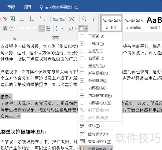 选中需装饰的文字段落,在开始选项卡的段落组中点击边框下拉按钮,从列表中选择边框和底纹即可。