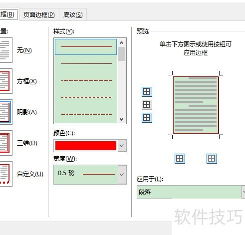 在边框和底纹对话框中,依次切换至边框与底纹选项卡,根据提示设置边框颜色、宽度、立体阴影效果及底纹颜色等参数。