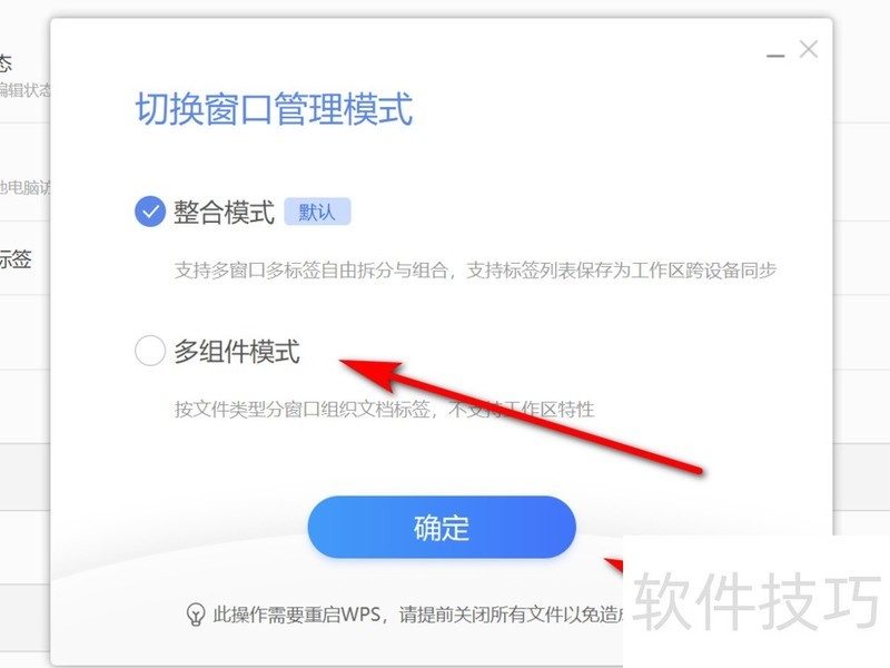 5、 在切换窗口管理模式界面,选择窗口模式点击“确定”,即可切换WPS窗口模式。