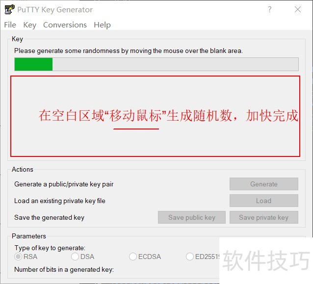 2、 选项默认,单击 Generate 按钮,生成新密钥对,在空白区域“移动鼠标”加快生成速度