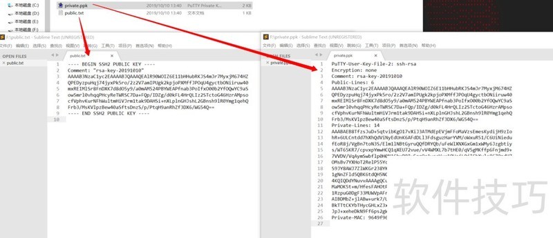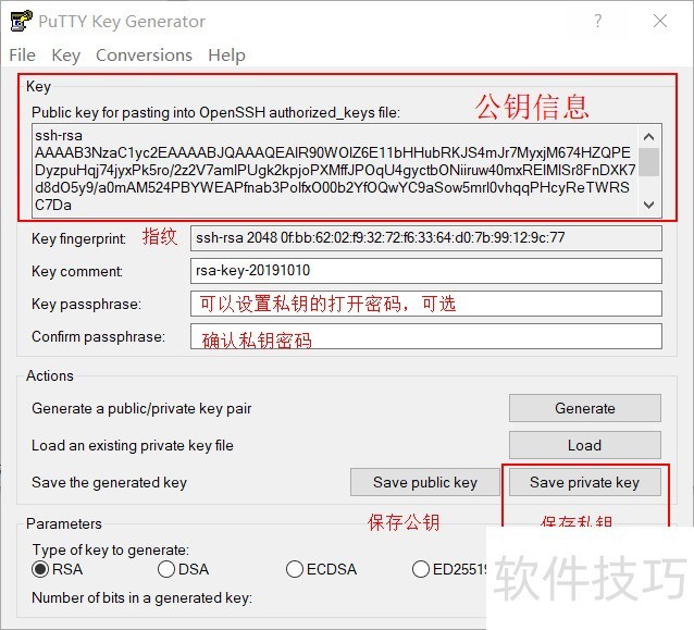 3、 生成过程完成后,保存密钥对(可选:添加私钥密码)公钥为一堆字符串,可以保存为.txt文件私钥也是一堆字符串,要保存为.ppk文件