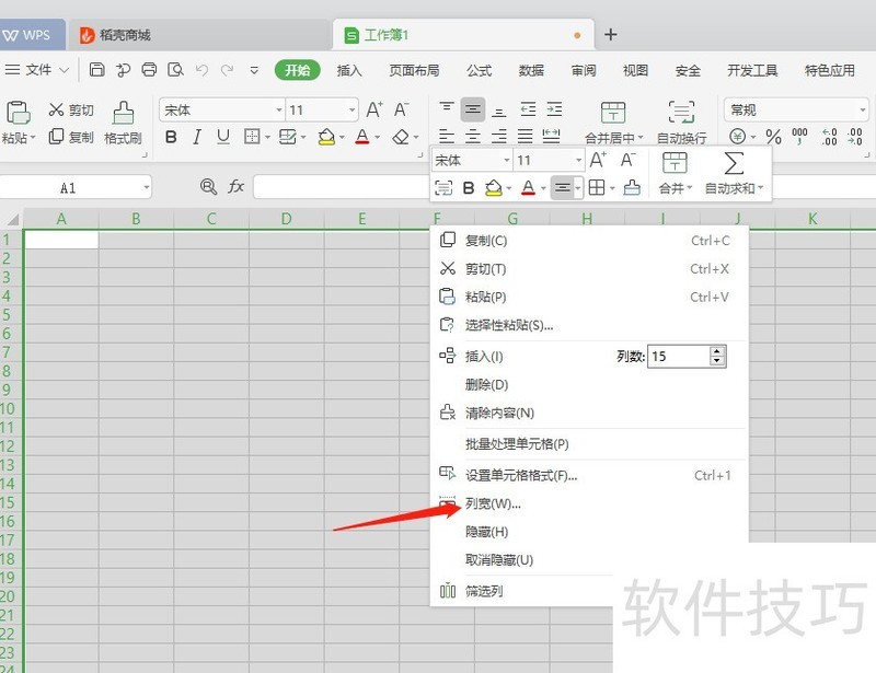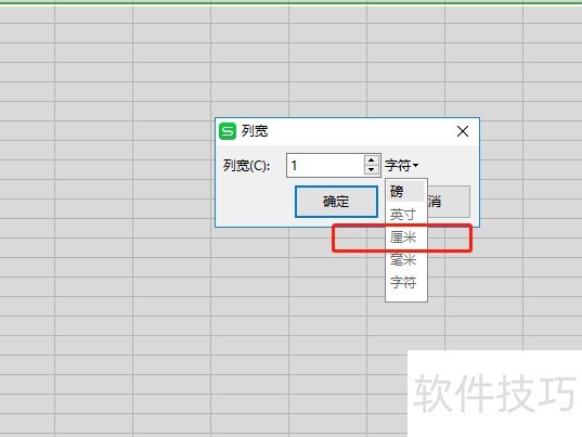3、 列宽这里数字输入1,注意右边下拉三角形这里要选择厘米。