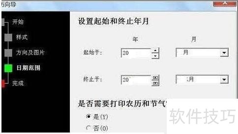 5、 在“日期范围”选项中,要制作日历的日期范围进行设置,例如,输入:2026年4月1日到2026年5月5日,在下面的“是否要打印农历和节气?”中输入是,也可以根据需要选择否;设置好后点击下一步;