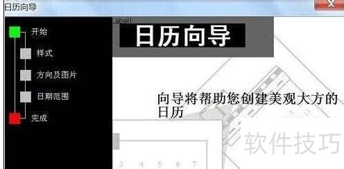 3、 系统自动进入日历向导;直接点击下一步;4、在日历样式中选择一种自己喜欢的样式,系统默认提供了三种样式,分别为标准,横幅,优秀,选择标准,点击下一步;