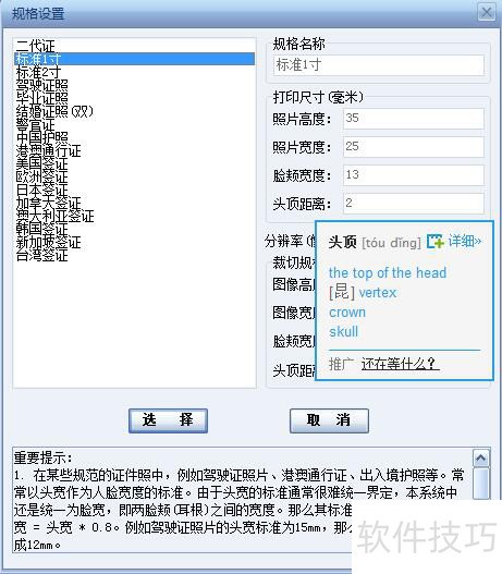 3、 所选择的证件类型不同,裁切好后,将得到的证件照片规格大小也不同,下面小编列举了2种证照规格,标准1寸。