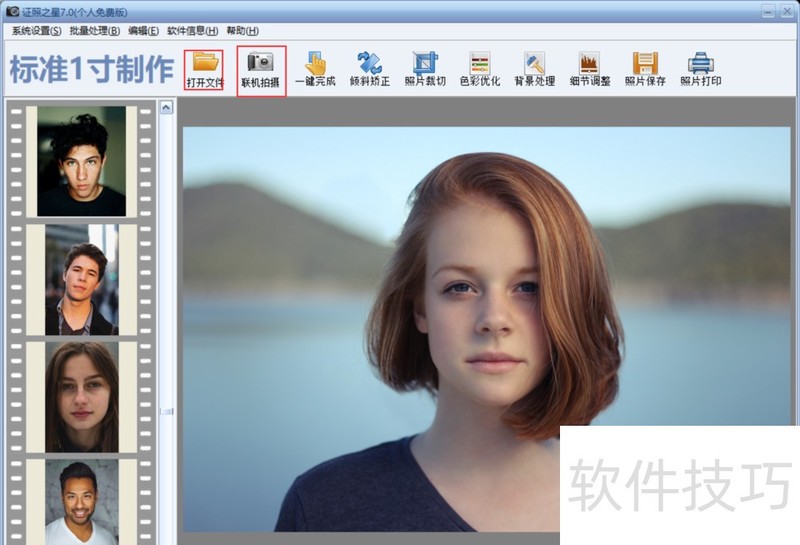 2、 将图片的原始素材添加到证照之星软件轨道上,以便于我们进行后期编辑。由于有些人选择自己用手机拍,也有些人则选择用电脑的外接摄像头来拍1、用手机拍的人,可以将拍摄好的照片发送至电脑上,再由我们自己将照片保存好,然后点击证照之星“打开文件”找到相应文件夹,然后将图片导入。2、选择使用外接摄像头拍摄的人,只用往镜头前一站,拍摄好的照片就会自动导入软件中。如图2