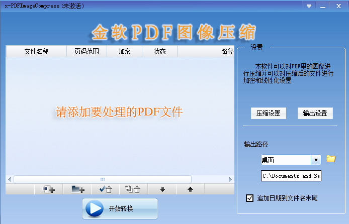 金软PDF图像压缩批量转换工具是一款功能强大的软件,由北京博信施科技有限公司开发。该软件具有批处理处理多个PDF文件的功能,可以同时对多个文件进行图像压缩。此外,它还提供了线性化设置,以提高文档浏览速度,并支持添加打开密码和权限密码来保护PDF文档的版权。用户可以根据需要设置不同的采样方式、图像比例和质量,并且可以将当前时间追加到源文件名末尾,避免输出时文件覆盖。同时,该软件还提供了查看PDF文件属性的功能,如标题、副标题、作者、关键字、创建日期、修改日期等信息。金软PDF图像压缩批量转换工具是一款专业而便捷的工具,适用于需要批量处理PDF文件并进行图像压缩的用户。