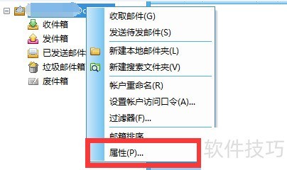4、 找到邮箱属性找到foxmail中需要配置自动收取邮件时间的邮箱后,鼠标右键需要配置自动收取邮件时间的邮箱,在邮件的功能菜单中,找到属性功能。