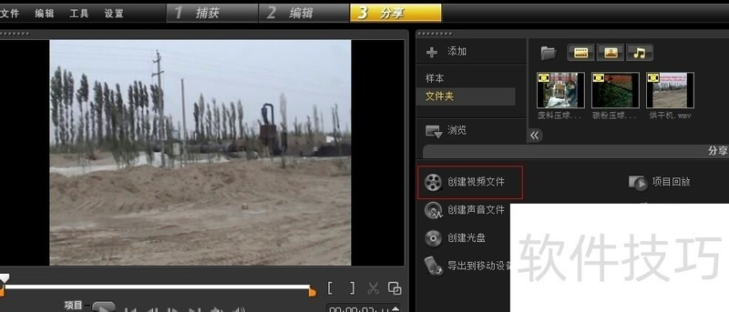 5、 选中剪辑的那部分视频,右击,弹出菜单,选中【删除】即可。6点击菜单栏的分享按钮,点击下面的【创建视频文件】,然后选择视频的输出格式,可以选择DV,HDV,DVD,WMV,WPEG等格式,开始输出视频。