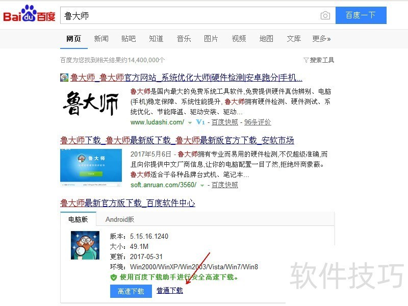 1、 首先网络一下【鲁大师】会出现鲁大师官网 还是就是通过网络软件中心的直接下载鲁大师
