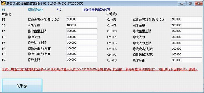 勇者之路2加强版修改器是一款针对游戏勇者之路2加强版的辅助工具。它提供了多项功能修改器,包括血量、法力和金钱等的修改,可以大大减轻游戏难度。使用该修改器需要先开启修改初始化,并且要注意修改等级只能提升到101级,超过这个等级会导致攻击为0。同时,真正的修改攻击防御的方法是通过“加强攻击防御为80万”来实现,在开启该功能后需要更换武器才能生效。建议使用4399游戏盒或者压缩包中的“勇者之路2加强版游戏桌面版.exe”来运行游戏,并使用对应的进程“4399Box.exe”或者“勇者之路2加强版修改器v1.02.exe”。