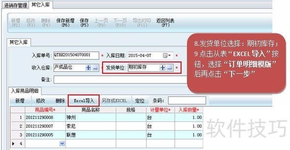 2、 打开其他入库或者期初库存,选择供应商为期初库存,选择入库仓库,入库商品明细列选择excel导入。
