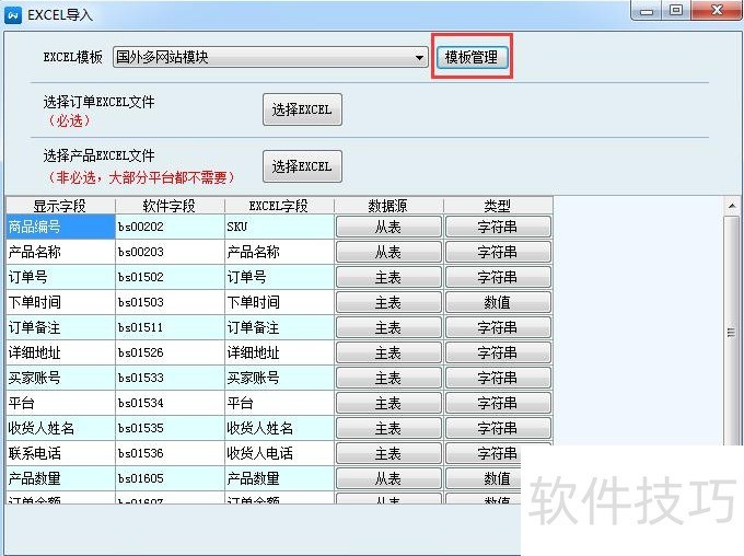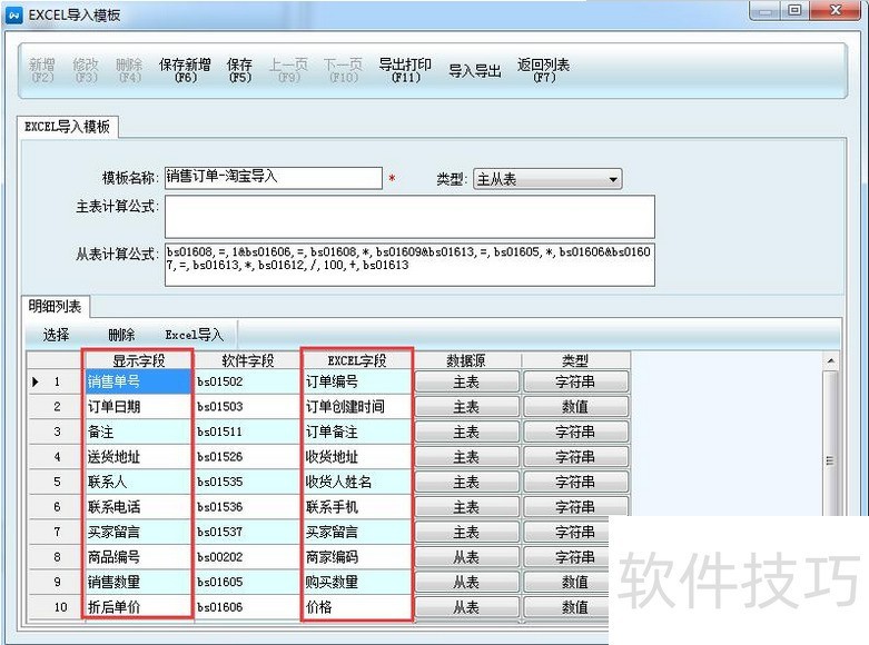 3、 弹出的模板修改窗中,显示字段是软件中显示字段名,Excel字段是导入的excel文件中特泪需要有的字段名,数据源和类型不能改。当文件中某些列的数据不能导入时,轿驼蹲会有出错提示。多余的字段名可删除。保存导入模板。