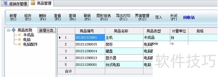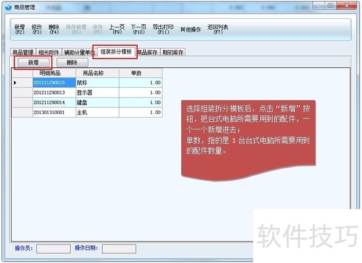 1、 假设台式电脑,是由鼠标、键盘、显示器、主机这四件配件组成而成的。1. 需要先在商品管理里面,把这4个配件和台式电脑先录入进去,如下图: