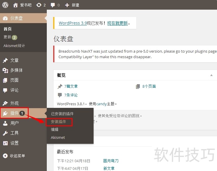 2、 进入后台,在右侧栏目上选择“插件”-》“安装插件”按钮。