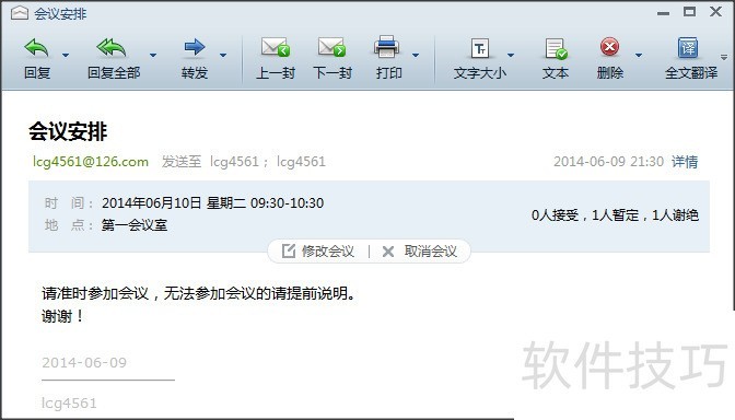 4、 在163和sina邮箱中会收到会议邀请。5双击打开会议邀请邮件,可以看到会议时间、会议地点等内容,以及对会议邀请的回复,可以选择【接收】【暂定】【谢绝】。这里我们让163谢绝会议,sina暂定。6在会议发起人126的【会议邀请】邮件中,可以看到1人暂定,1人谢绝。也就是表示会议无法准时举行。这里对会议进行修改。点击【修改会议】。