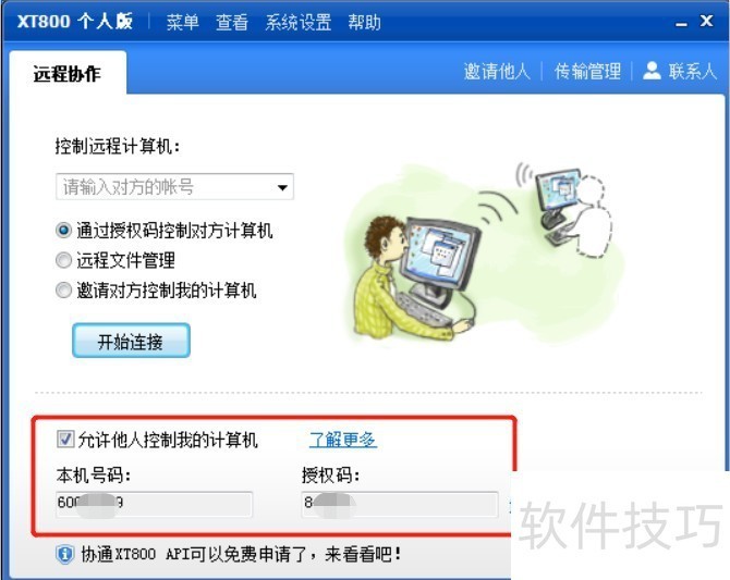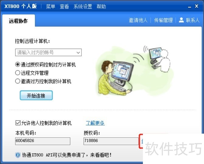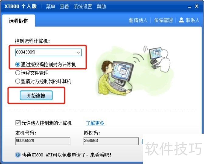 7、 同样在另一台电脑上安装XT800程序打开程序后,在控制远程计算机里输入上一台电脑的本机号码勾选【通过授权码控制对方计算机】点击【开始连接】