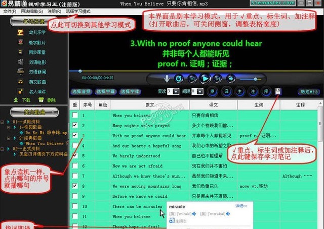易精通唱英文歌学英语软件是一款功能强大的英语学习工具,具有7种学习模式和14项功能,能够帮助用户快速高效地学习英语。该软件采用真正的母语式、沉浸式、情景式教学法,兼备影音播放、按句复读、点读、录音、词典等功能。用户可以指词即译,4种字幕显示,并且学习资料可任意扩展,如新概念英语1-4、世界英文散文精粹等。此外,该软件还兼容金山词霸、有道词典和灵格斯词霸三大免费词典,并支持十种学习模式和17项功能。易精通唱英文歌学英语软件操作简捷,学员能轻松高效地练听力、学口语、学翻译、背单词。同时,该软件采用护眼色设计,不伤眼。易精通唱英文歌学英语软件是一款非常实用的英语学习工具,值得推荐。
