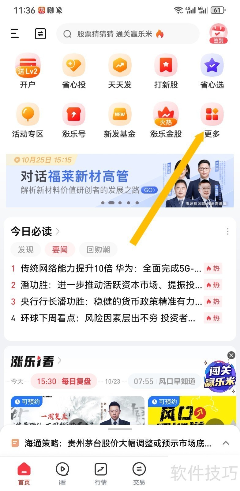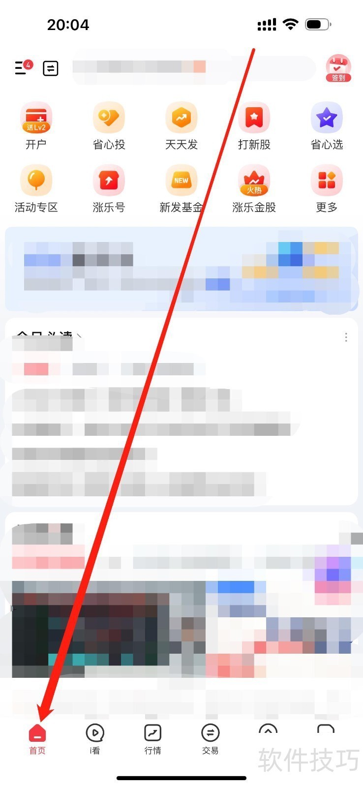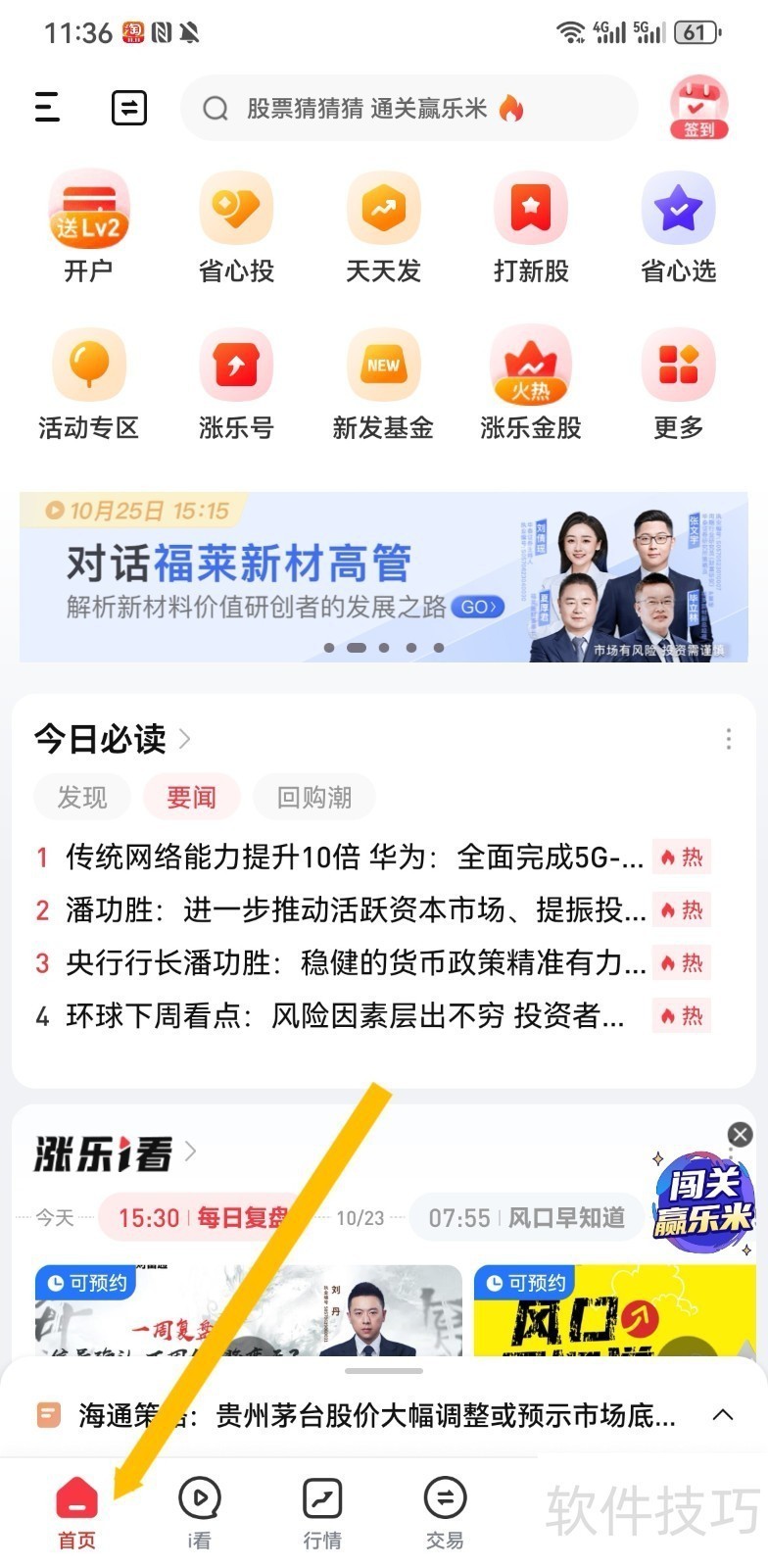 1、 打开涨乐财富通后,点击页面左下角的"首页"