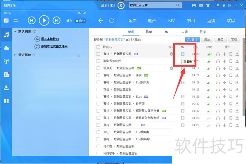 2、 找到你想要唱的歌了,就点击MV。