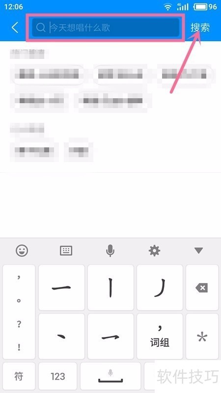 3、 打开【搜索】,输入你想唱的歌,点击【搜索】。