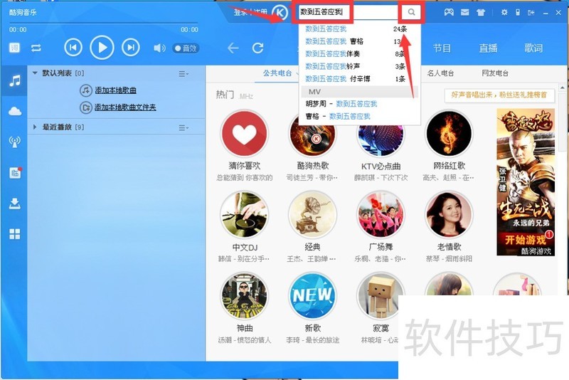 6、 安装完成后,打开酷狗,点击歌曲过行播放。