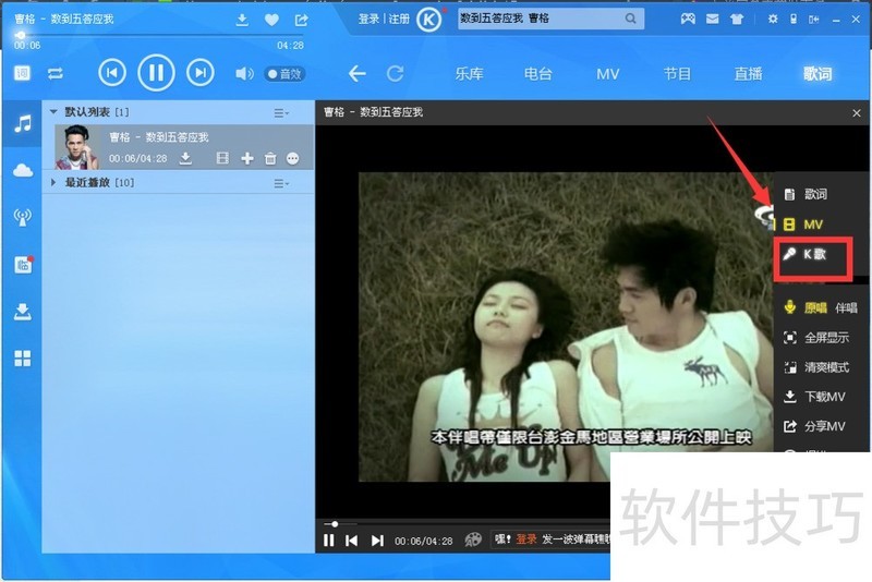 3、 打开你喜欢的歌MV后,鼠标箭头滑到MV右面,会出现一个小框,点击K歌。