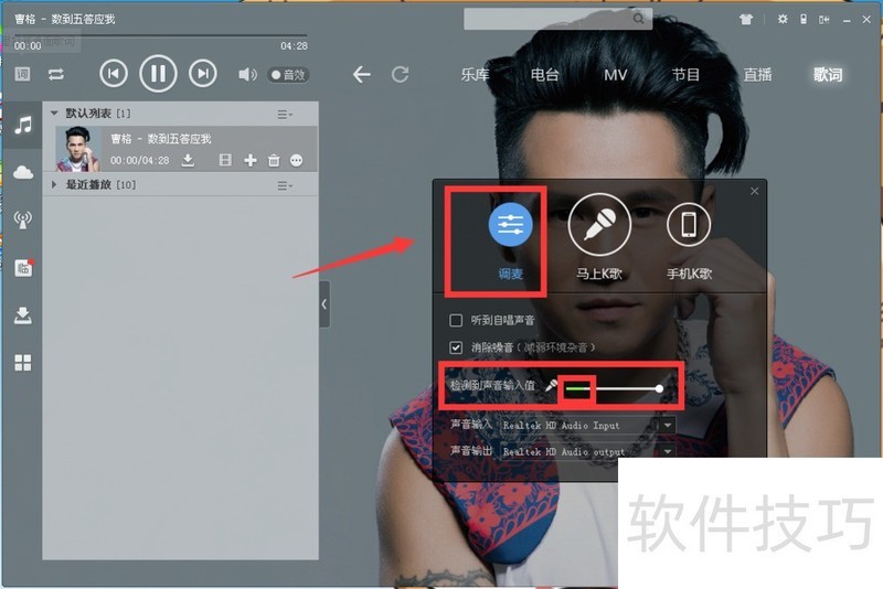 4、 先不要点击马上K歌,先“调麦”,看看麦是否可以说话,有声音的话检测的声音就会是绿色条状。