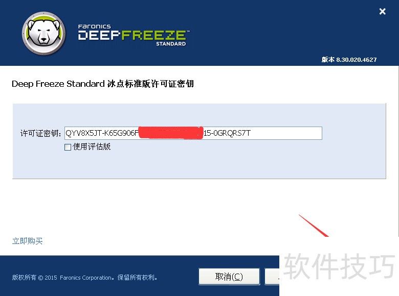 5、 输入冰点还原标准版密钥,也可以用评估版进行安装,以后再注册。下一步