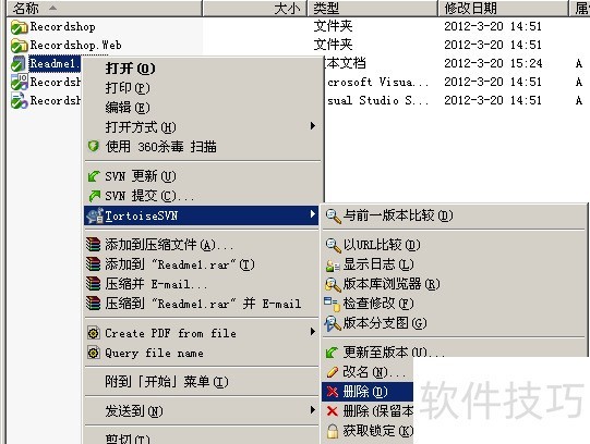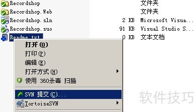 8、 4)、如何删除文件?使用TortoiseSVN更新,使用TortoiseSVN删除工作副本中的Readme.txt文件,然后提交,版本库中的相应文件即被删除掉了,如下图所示: