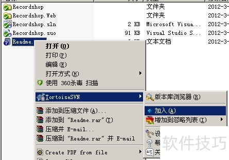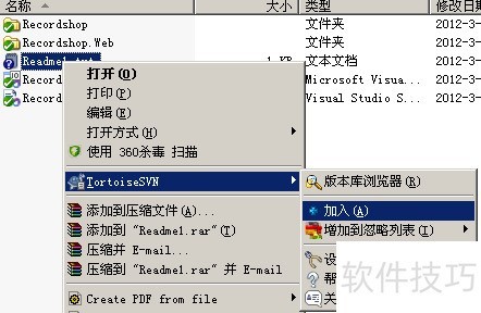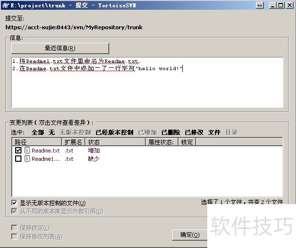 7、 和添加文件一个道理,这时候你需要告诉TortoiseSVN你的操作,加入以后,提交,这时候版本库中的Readme.txt文件将会被重命为"Readme1.txt"。如下图所示: