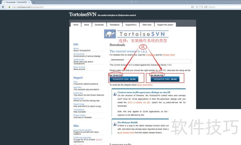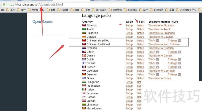 3、 打开TortoiseSVN官网的下载界面,会看到有中文简体和繁体的两个版本,而且还区分32位和64位,根据需要下载即可。