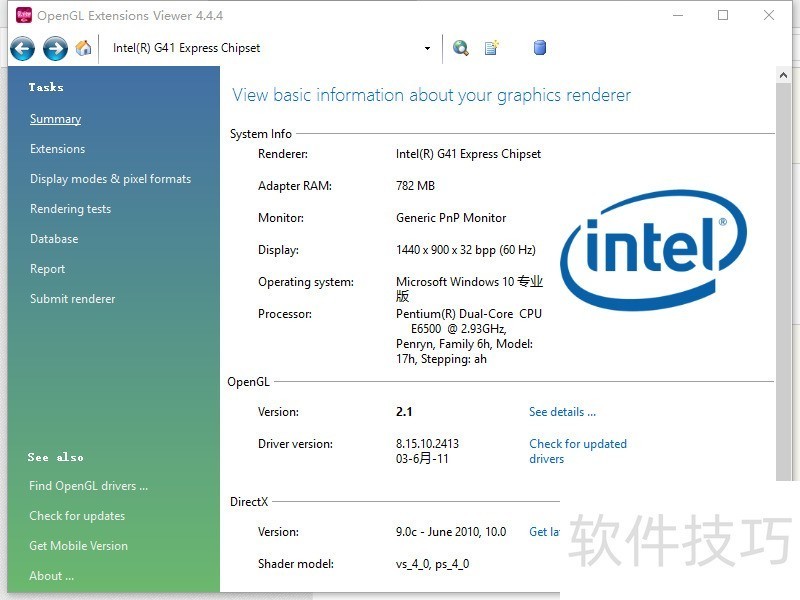 4、 查看OpenGL和DirectX信息打开后在Summary页面可以看到:System Info里是显卡和显示器的硬件属性OpenGL里是OpenGL的协议版本和生效日期DirectX里是DirectX的协议版本和生效日期
