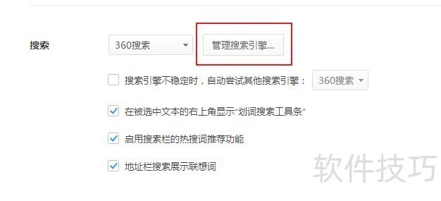 3、 ⒔?氪耸被峤??60极速浏览器的基本设置页面中,在页面右侧找到“搜索”这一栏,如下图所示点击“管理搜索引擎”按钮。