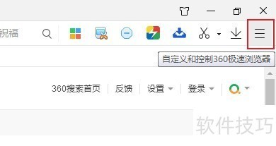 1、 ⒋蚩?60极速浏览器,点击浏览器右上角的“自定义和控制360极速浏览器”图标打开浏览器菜单窗口。