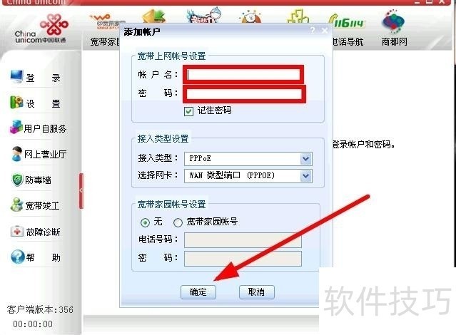 6、 下载安装完成后,打开软件,在弹出的添加账号界面,填写我们的宽带账号,密码,信息完成点击下方的确定按钮。