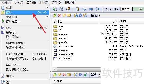 4、 也可以通过文件菜单中的打开功能来打开镜像文件。