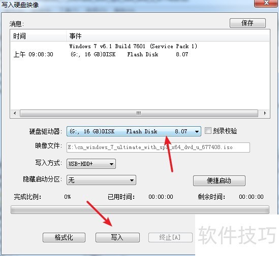 6、 硬盘驱动器中选择U盘,U盘会被格式化,点击【写入】